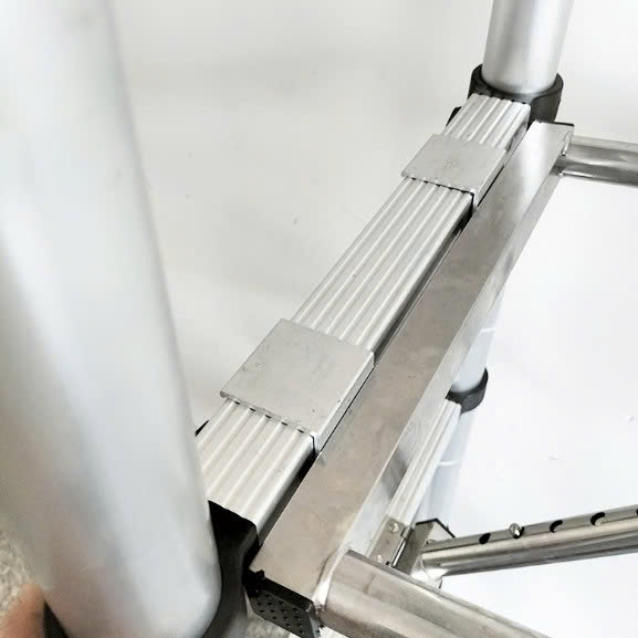 - Thanh chống ngang gia cố độ bền: Phụ kiện được trang bị các thanh chống ngang bằng inox chắc chắn, kết nối hai bên thân thang. Các thanh này giúp phân tán lực đều trên toàn khung thang, giảm nguy cơ cong vênh hoặc rung lắc khi leo cao, đặc biệt ở độ cao trên 2,5m hoặc khi mang theo dụng cụ nặng.