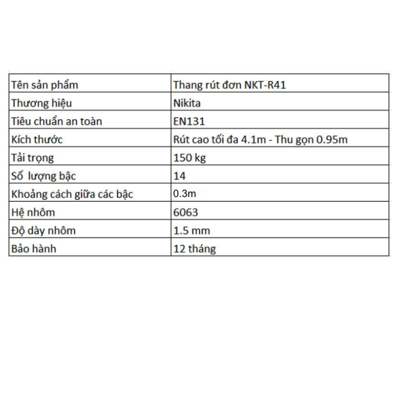 • Thang nhôm rút đơn Nikita với thiết kế nhỏ gọn, linh hoạt trong sử dụng, có độ bền chắc chắn, tải trọng cao, thuận tiện khi thi công ở những vị trí cao, hẹp.