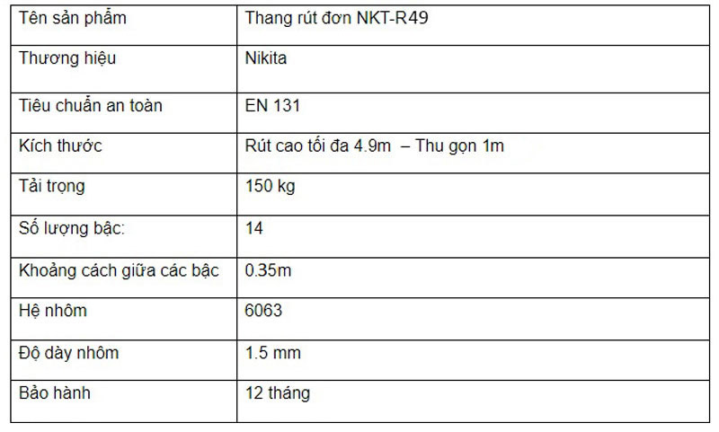 • Thang nhôm rút đơn Nikita với thiết kế nhỏ gọn, linh hoạt trong sử dụng, có độ bền chắc chắn, tải trọng cao, thuận tiện khi thi công ở những vị trí cao, hẹp.